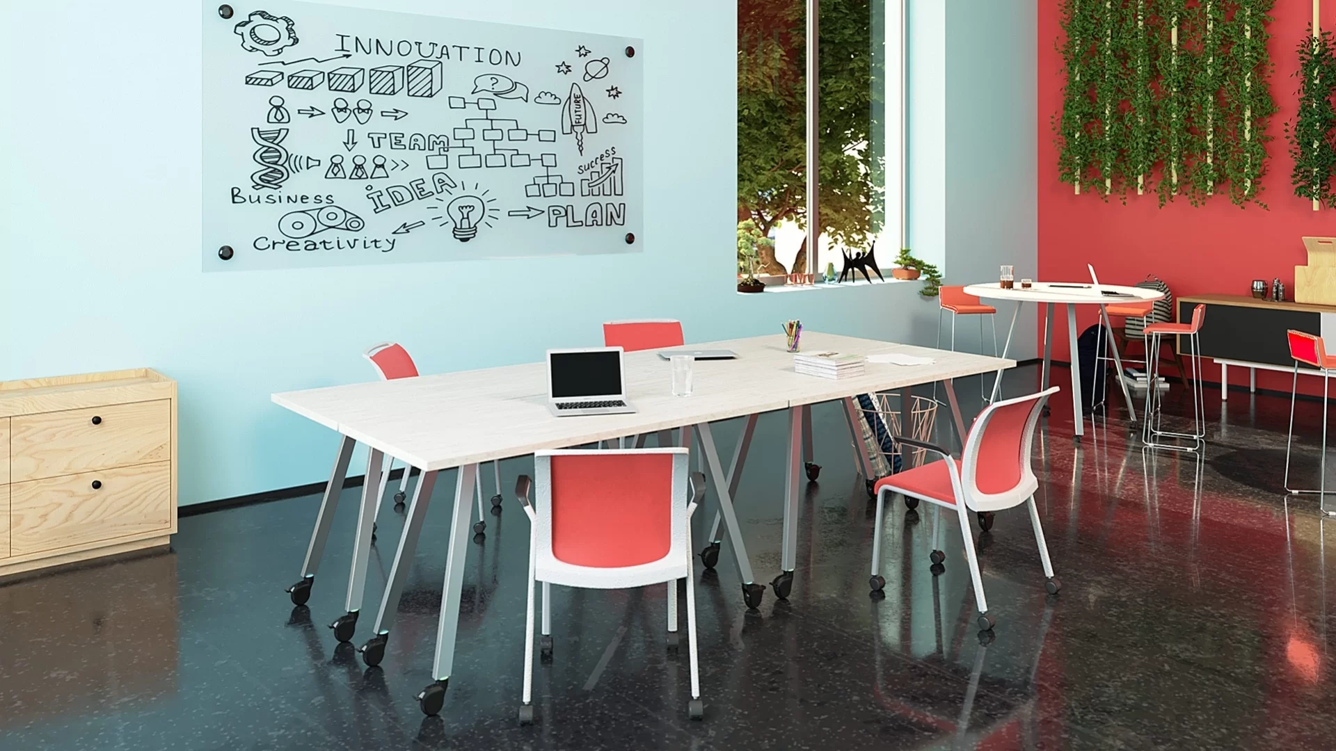 AIM table celebrates an attractive modern design suitable for a variety of interiors and delivers a high level of sophistication to any space. It bridges the gap between the traditional work spaces and a new generation of workers who are on the move throughout the day to focus on their work in a private setting, collaborate in groups, or connect in informal gathering areas. AIM supports the need for flexibility with three table heights, several shapes and sizes, premium casters, and versatile charging options.